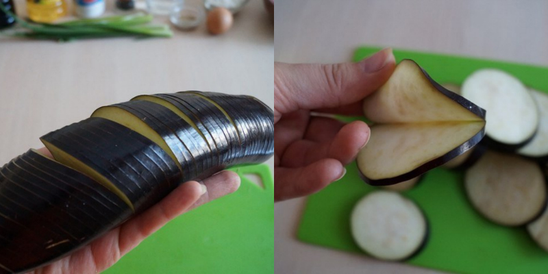 Пригответе патладжана, като направите напречни сечения. Не спускайте ножа докрай, резените трябва да се слепят. В резултат на това ще стигнете до нещо, което прилича на акордеон. Разделете филийките, движейки се през един, за да направите джобове.