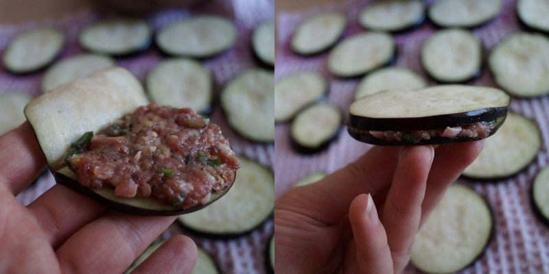 Нарежете малки филийки от патладжан и използвайте за кайма. Нарежете зеления лук и добавете към каймата. Налейте там лъжица соев сос, добавете сусамовите семена, сол и черен пипер на вкус. Разбъркайте добре сместа.