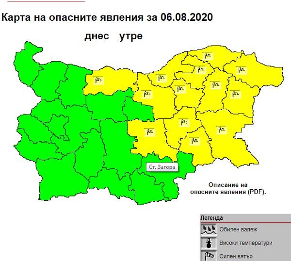 Жълт код за силен вятър е обявен в 13 области в страната за 6 август, сочи справка в сайта на Националния институт по метеорология и хидрология (НИМХ). Предупреждението е в сила за областите Плевен, Велико Търново, Стара Загора, Сливен, Ямбол, Бургас, Варна, Добрич, Шумен, Силистра, Разград, Търговище и Русе.