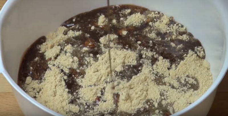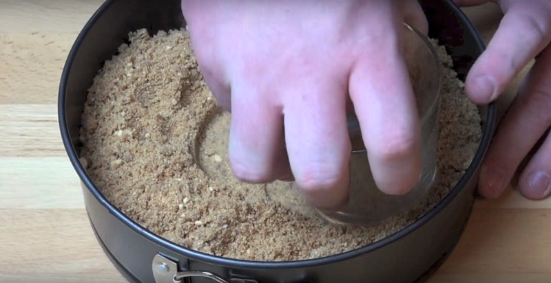 След известно време извадете основата за торта от хладилника. Поставете във форма и загладете с чаша.