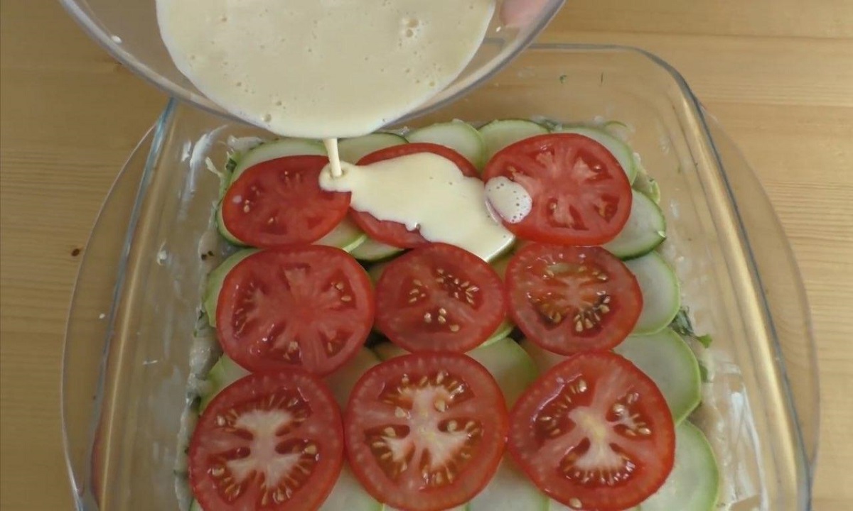 За да залеете, разбийте яйцата със заквасена сметана. След това залейте отгоре и го изпратете в предварително загрятата фурна за 30 минути. Печете на 180 градуса. 5 минути преди готвене трябва да извадите формата, поръсете с кашкавал и изпратете обратно във фурната.