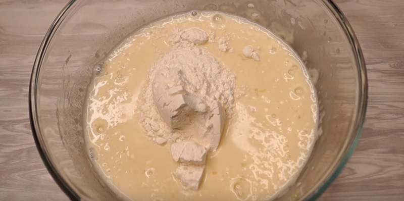 За да приготвите тестото, разбийте яйцето в купа, изсипете млякото, добавете захарта, солта и разбъркайте всичко добре с размахване до гладкост. Към получената смес добавете пресятото брашно и разбъркайте тестото, докато в него не останат бучки.
