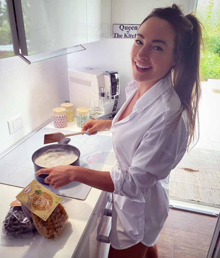 Надарената спортистка реши да сготви макарони, типично ястие за Апенините. Тя бе облечена само в бяла секси рокличка, докато върши домакинските си задължения. А усмивката никога не слиза от лицето на олимпийската шампионка.