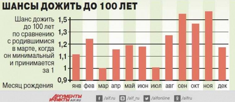 Оказва се, че децата, родени през септември или ноември, имат най-голям шанс да живеят дълго. Най-голям е броят на столетниците, родени през ноември, а най-малък през март.