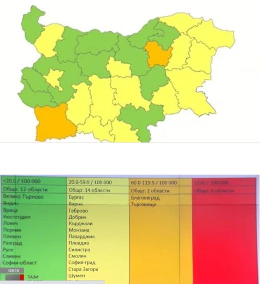 Проф. Кантарджиев коментира и графика, на която се виждат по-тежко засегнатите области. Те са в оранжев цвят. Директорът на Националния център за заразни и паразитни болести отбеляза, че няма области в червено.