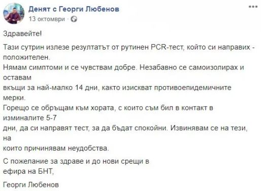На 13 октомври водещият на БНТ Георги Любенов лично обяви, че е дал положителен тест за коронавирус. Веднага след това журналистът се самоизолира.