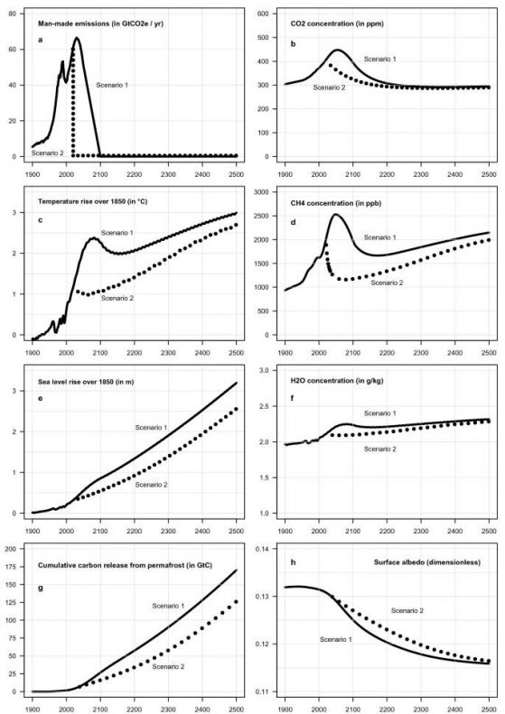Емисии на парникови газове, причинени от човека (a), глобална средна повърхностна температура (c), повишаване на морското равнище (e) и кумулативно отделяне на въглерод от пермафроста (g) в два сценария от 1900 до 2500. Показани са също концентрацията в атмосферата на CO2 (b), CH4 (d), H2O (f) и повърхностното албедо (h). Плътните черни криви показват сценарий 1, при който антропогенните емисии парникови газове се премахват до 2100 г. Кривите с черни точки показват сценарий 2, при който антропогенните емисии на парникови газове са намалени до нула през 2020 г. И в двата случая глобалната температура продължава да се повишава в продължение на стотици години след като са прекратени всички антропогенни емисии. Кредит: Scientific Reports, DOI: https://doi.org/10.1038/s41598-020-75481-z