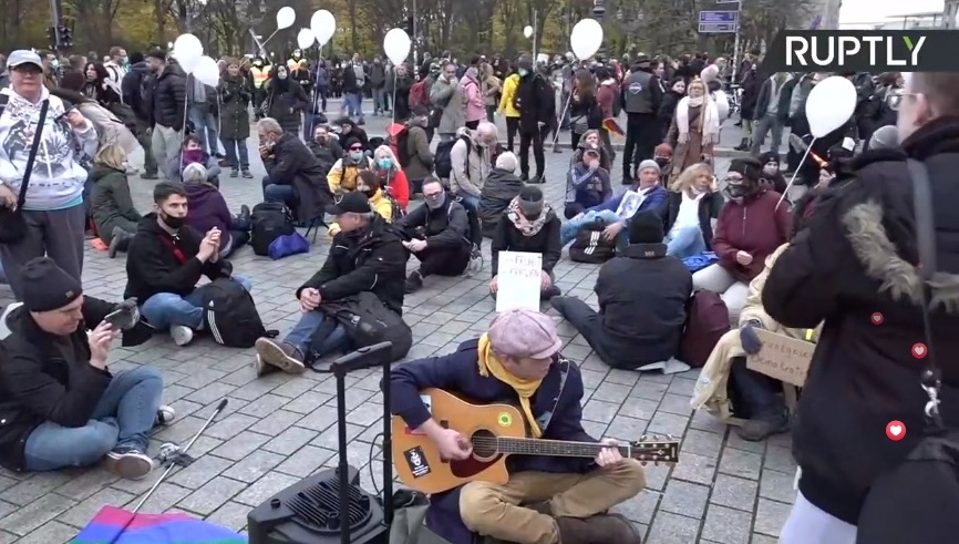 Протестиращите носят плакати срещу ограничителните мерки по повод коронавируса и скандират „Ние сме народа!“.
