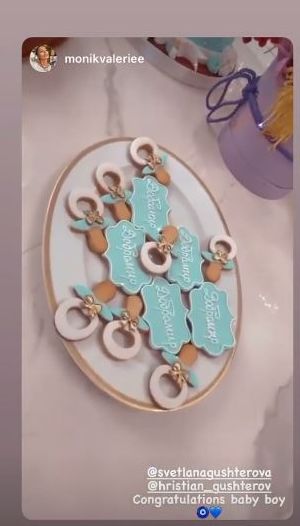 Сред тях бе кумата й и моделката Моника Валериева, които показаха кадри от празничната трапеза. На нея освен питка, почетно място заема красива торта в синьо и много сладки, на които е изписано името на новопоявилотото се бебче.