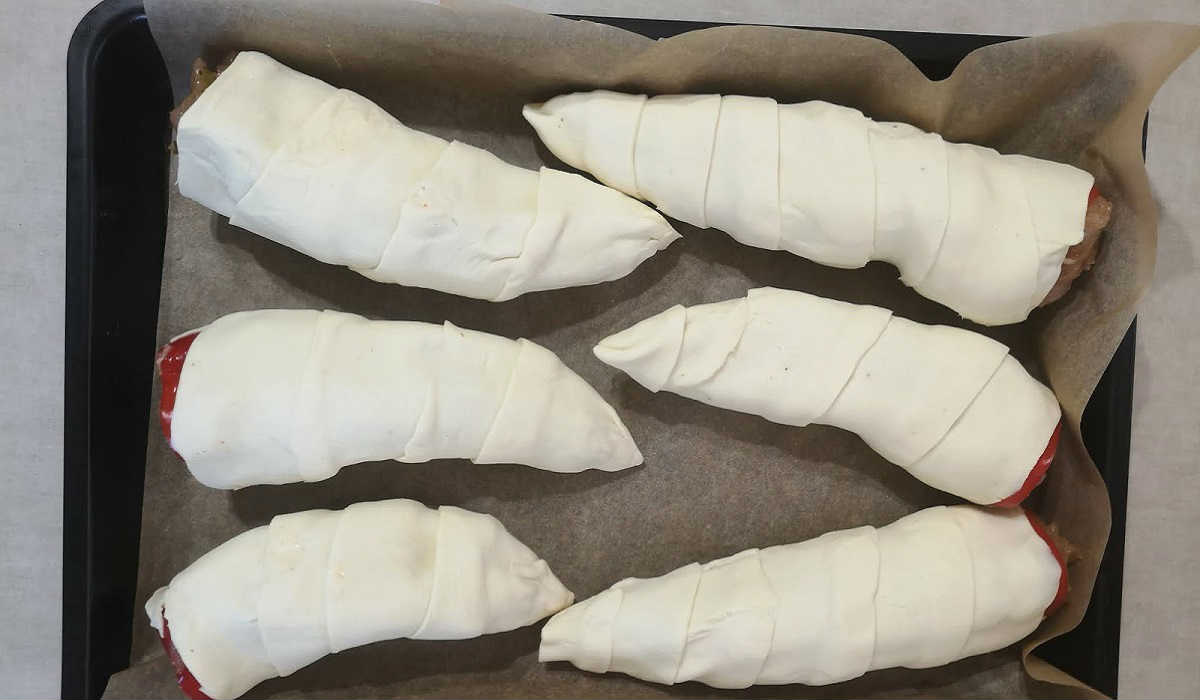 Нарежете бутер тестото на дълги ивици и завийте всяка чушка