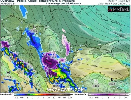 Валежи от дъжд очакваме над крайните южни райони от страната, където са възможни и гръмотевици. Много дъжд ще се изсипе над Родопите и Северна Гърция, а по-късно през деня на 8-ми декември и над Североизточна и Източна България.